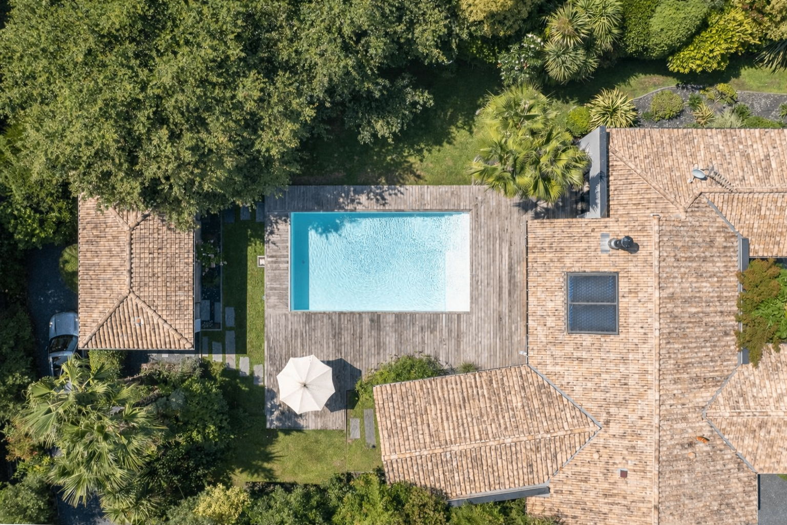 L’ensemble est implanté sur une parcelle de 2 179 m², entièrement close, arborée et paysagée, accueillant piscine et espaces de détente extérieurs.